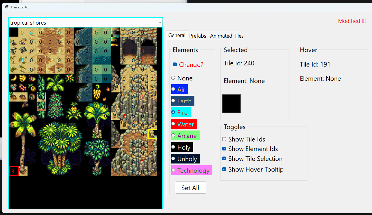 Well.. I should show a little progress. So.. this is the tileset editor. Since this game is both skill (like EVE online) based AND element based.. each tile can be aligned to an element (or none). This will help with the calculations for healing, damage, etc.